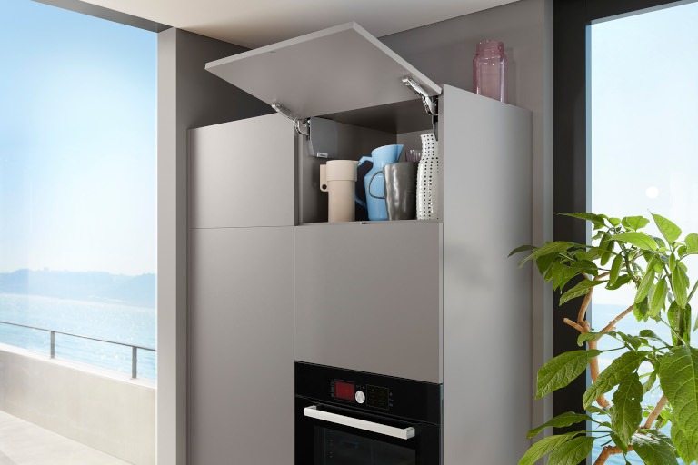 Klepscharnieren van Blum zijn ideaal voor kleine fronten in hoge kasten en bovenkasten. Met het klapdeurbeslag van Blum kan de opbergruimte optimaal worden benut. Daarbij wordt het compacte klepbeslag harmonieus in kleine corpussen geplaatst. Het maakt indruk met zijn grote montage- en bedieningscomfort. De Aventos HK-S is voor corpushoogtes tot 600 mm en corpusbreedtes tot 1800 mm.